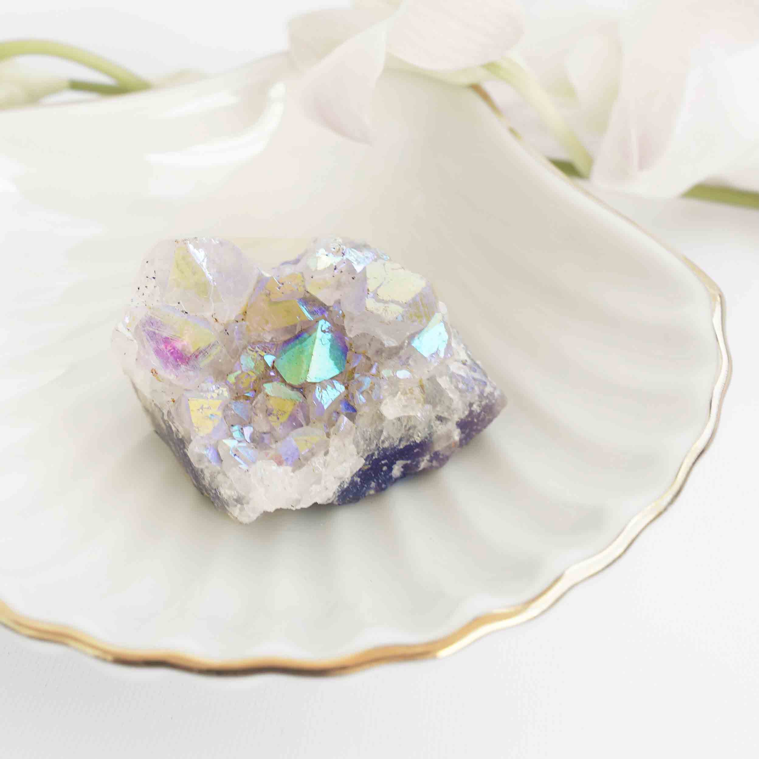 Aura Amethyst is believed to be a powerful crystal for spiritual growth and emotional healing. It is believed to stimulate and balance the Third Eye and Crown Chakras. promoting spiritual awareness and enhancing intuition and psychic abilities. Aura Amethyst is also believed to promote emotional healing. helping to release negative emotions and promoting a sense of peace and tranquility in the mind and body. Overall. Aura Amethyst is a powerful crystal for those seeking spiritual growth. emotional healing. and inner peace.