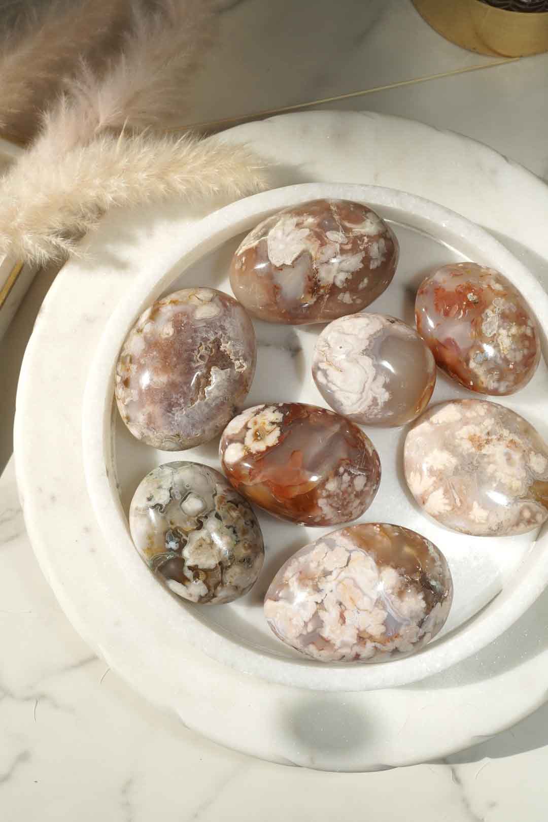 Flower Agate supports personal growth. helps you manifest your potential and fight fear. This crystal will help you find and keep inner peace. empathy and joy. Through the root chakra Flower Agate will help you release stress and anxiety. and become more calm. Just like several other protection crystals. this stone both shields you from negativity and brings good luck.
