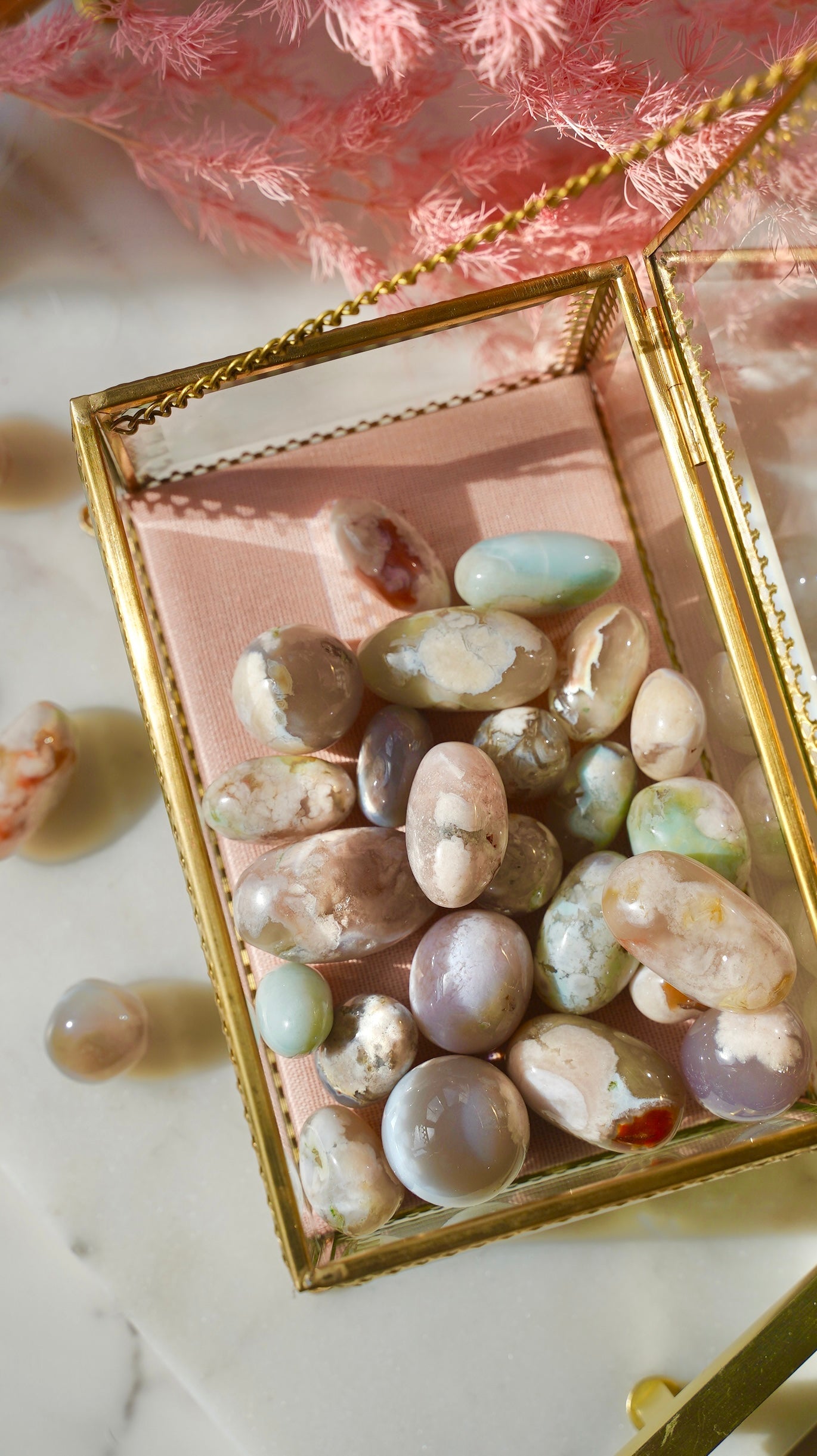Flower Agate supports personal growth. helps you manifest your potential and fight fear. This crystal will help you find and keep inner peace. empathy and joy. Through the root chakra Flower Agate will help you release stress and anxiety. and become more calm. Just like several other protection crystals. this stone both shields you from negativity and brings good luck.